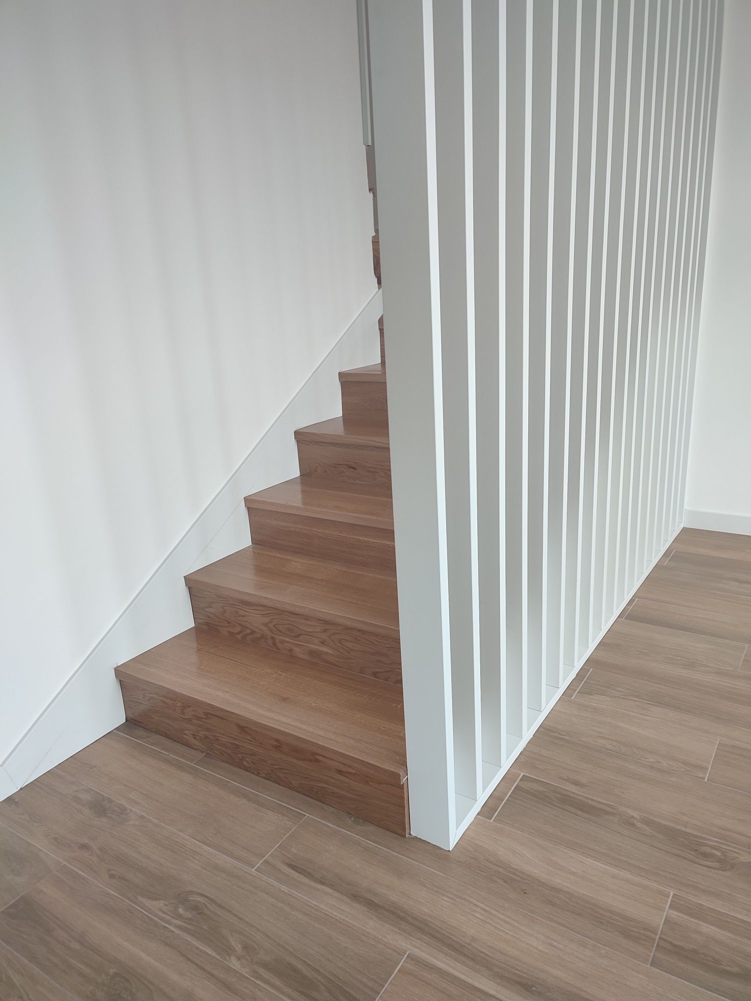 Completa la renovación con nuestros pasos de escalera barnizados y rodapie a medida. ¡El acabado perfecto para un ambiente sofisticado y personalizado!
