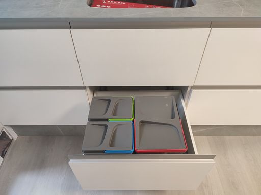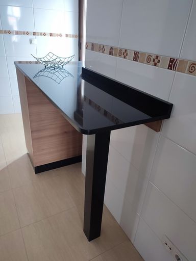 Una mesa de comedor con isla de altura encimera para todo en uno. Añades una distribución en cuadrado con accesorios de priemra y ya tienes un vistazo de esta cocina.
