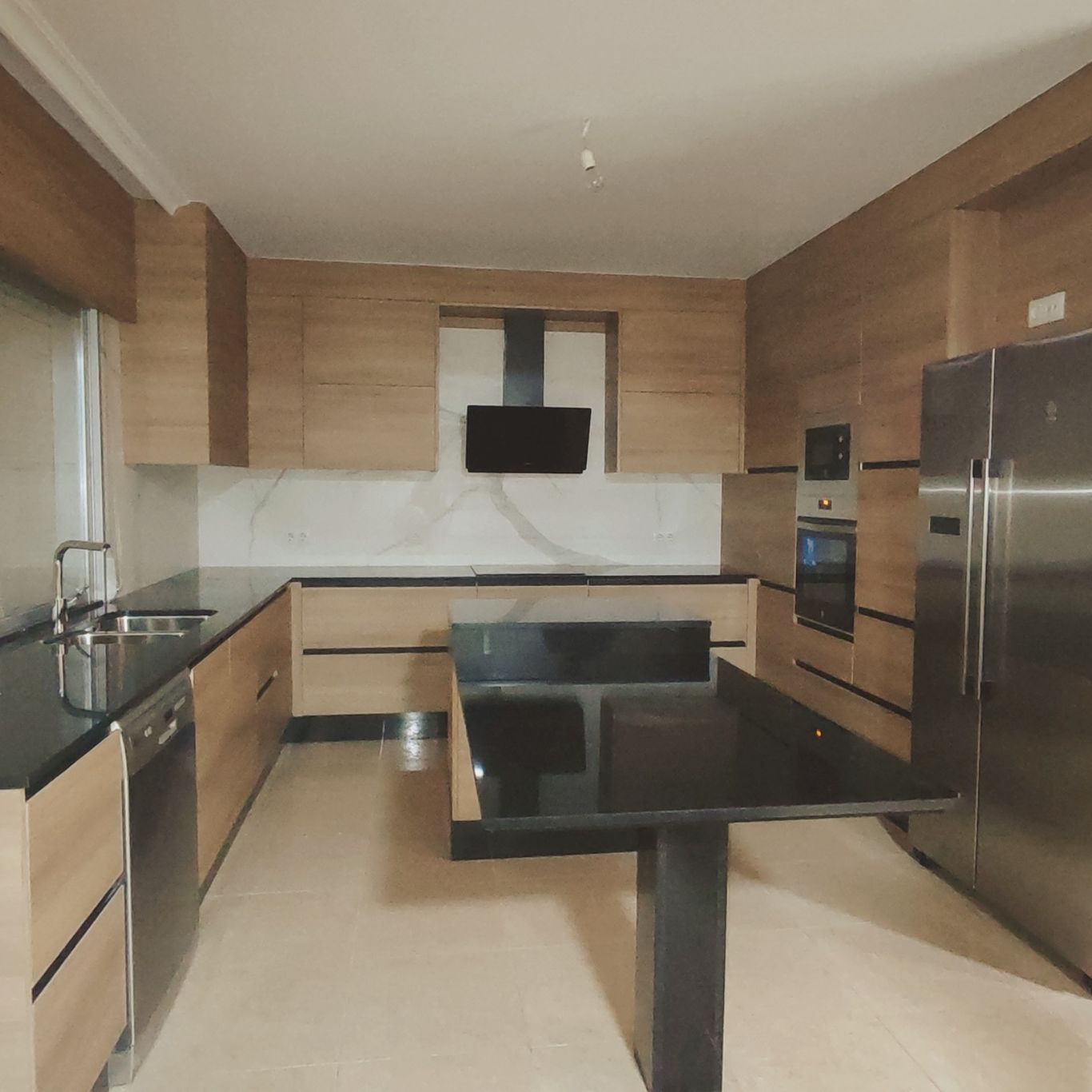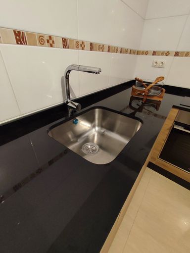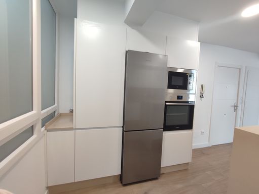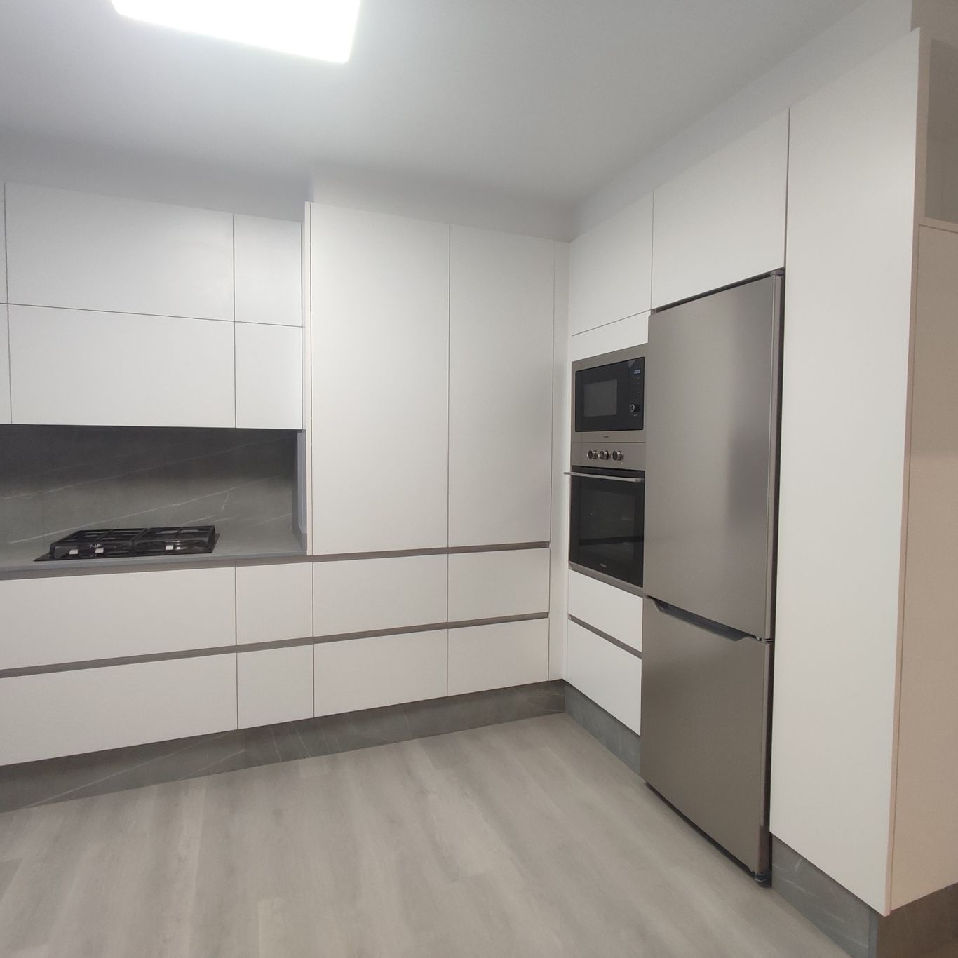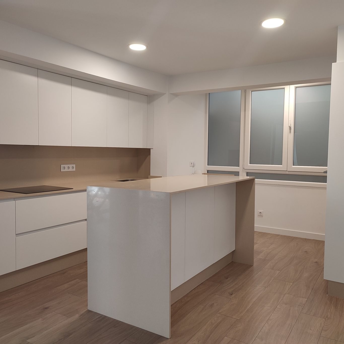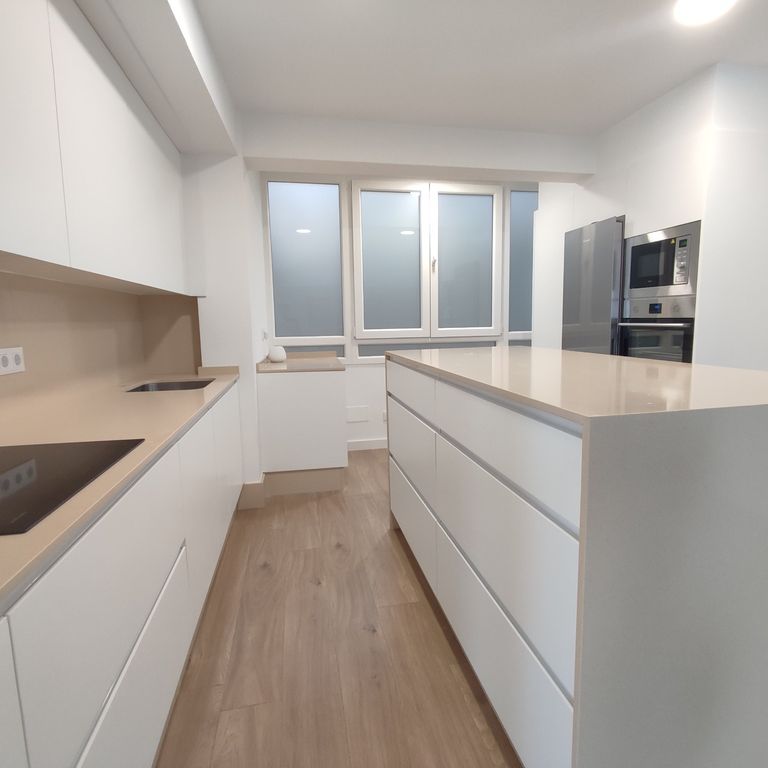Acoge a una pareja en esta isla de altura de barra con ajones, dos frentes y una lavandería, la cocina más completa y moderna en blanco con encimera y tarima de color arena.