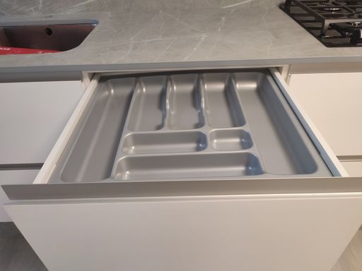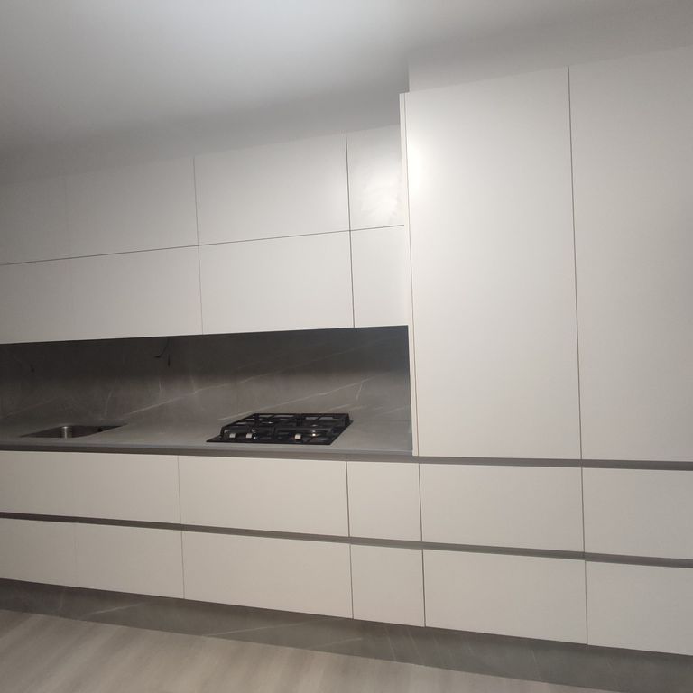 Descubre esta cocina monocromática con uñeros decorativos y aprovecha hasta el último rincón para almacenamiento cone ste panelado blanco contra encimera gris.